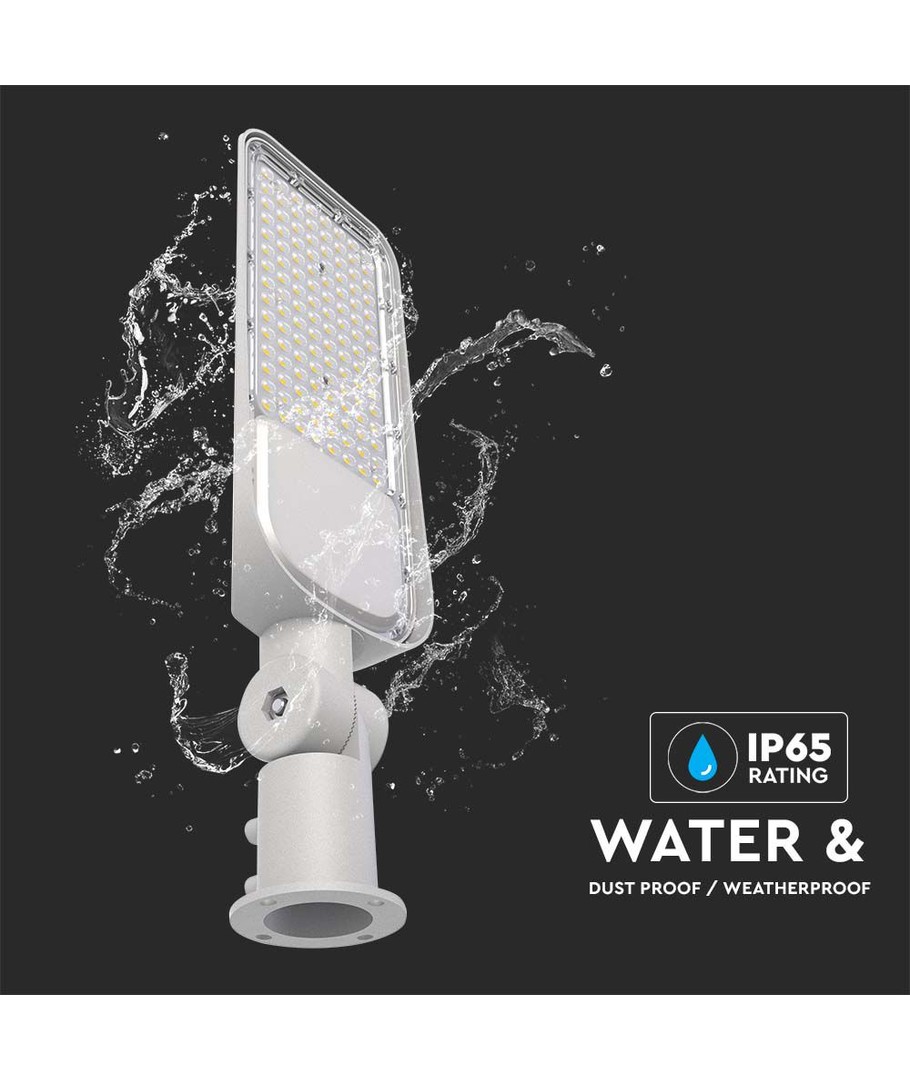 De lampbehuizing heeft de afmetingen 470 x 99 x 149 mm en is ontworpen om zware buitenomstandigheden te weerstaan. Met een IP65 classificatie kan deze LED straatlamp veilig buiten worden gebruikt, omdat hij beschermd is tegen waterdruppels en regen.