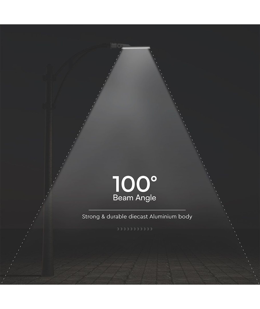 V-Tac 100W LED straatlamp met Samsung chip is een efficiënte en duurzame oplossing voor buitenverlichting, die zorgt voor optimale lichtverdeling en energiebesparing.