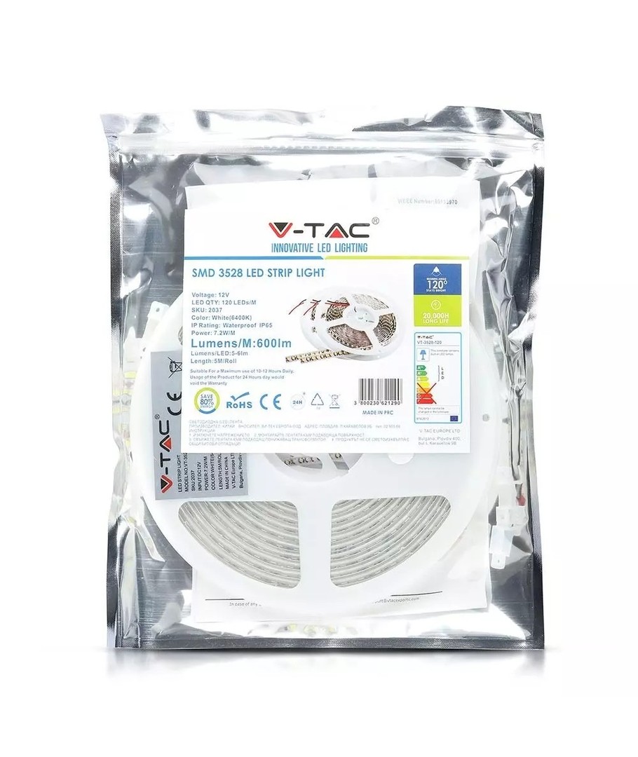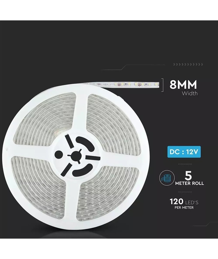 Upgrade je verlichtingsomgeving met deze innovatieve V-Tac LED strip, die energie-efficiëntie combineert met fantastische lichtkwaliteit. Deze 7,20W/meter LED strip is perfect voor zowel binnen- als buitengebruik dankzij de IP65 classificatie, wat betekent dat hij bestand is tegen spatwater en regen.