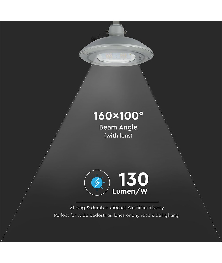 Met een vermogen van 100W en een aangesloten lichtsterkte van 13.000 lumen, levert deze straatlamp een indrukwekkende lichtverdeling die zorgt voor een gelijkmatig verlicht gebied. De spreidingshoek van 160/100 graden maakt hem ideaal voor gebruik in diverse buitenomgevingen.