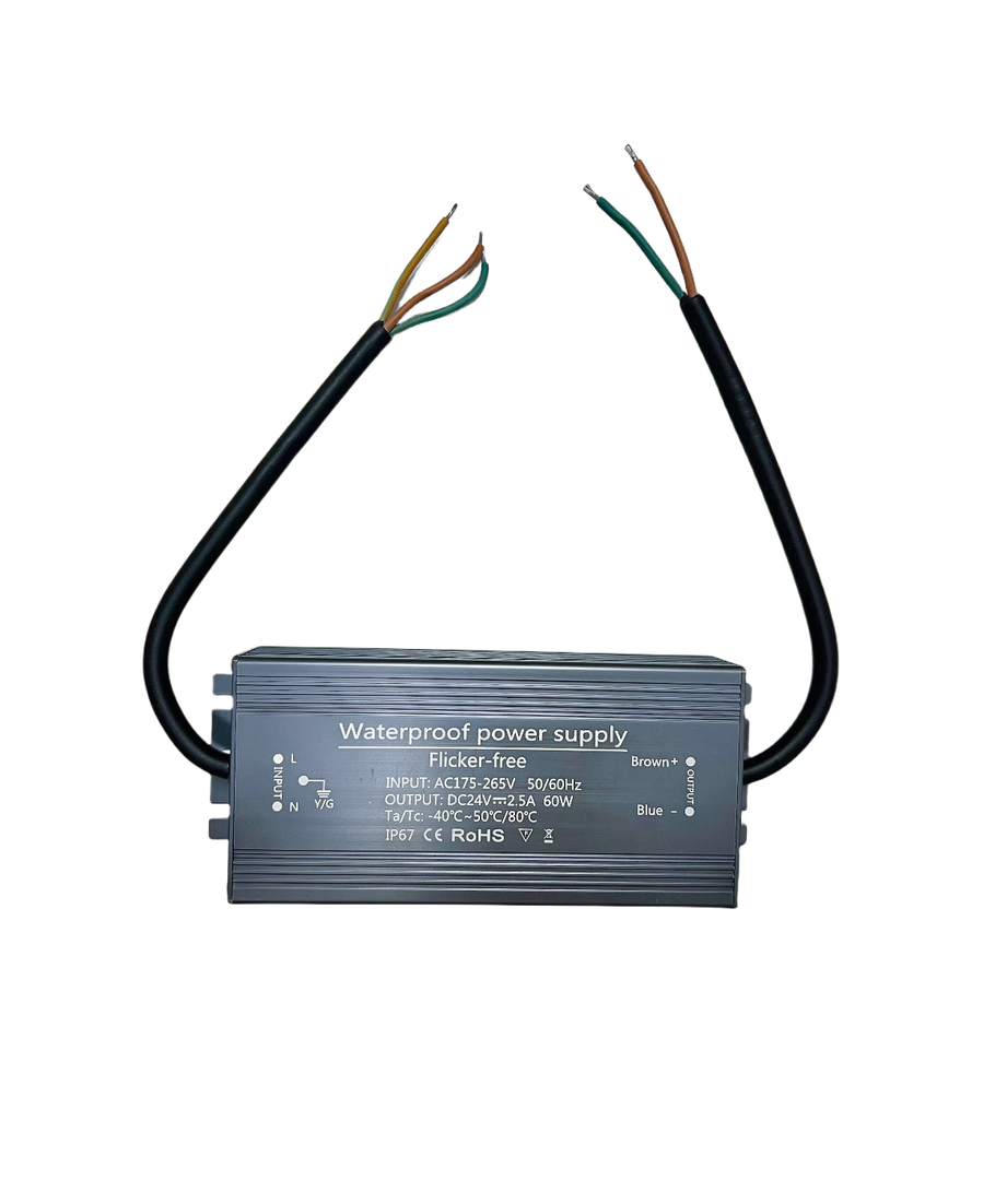 De nieuwe 60W voeding 24V DC - 2,5A levert betrouwbare stroom zonder flikkering en is perfect voor zowel binnen- als buitengebruik dankzij de IP67-certificering.