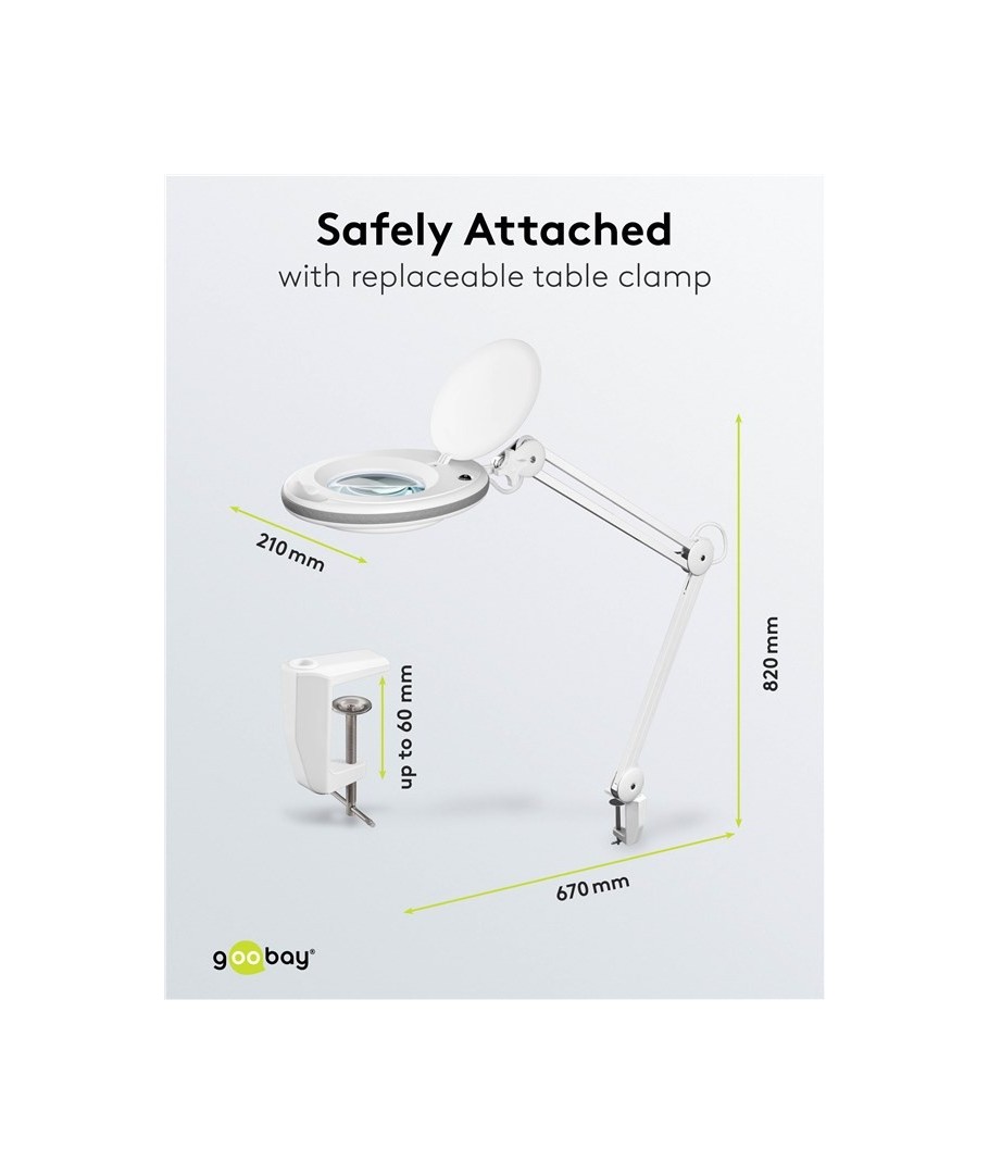 Klem voor het tafelblad: Met een klem die geschikt is voor tafelbladdiktes tot 60 mm, is deze lamp eenvoudig te monteren op elke werkplek. Je kunt de optimale verlichting en vergroting creëren waar je het het meest nodig hebt.