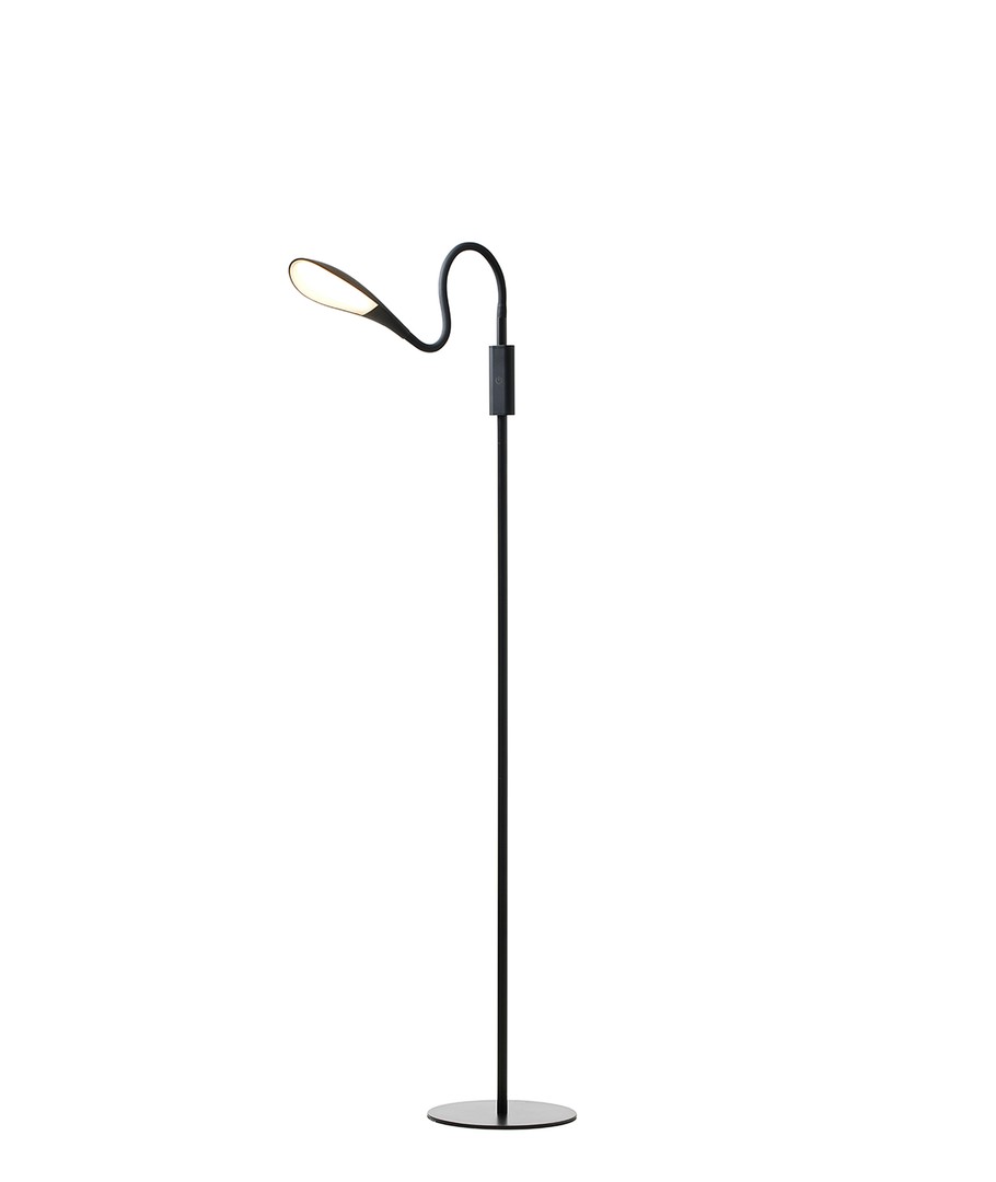 Zwarte LED vloerlamp van Nielsen Light genaamd Mamba in een uniek design. De lamp heeft een ingebouwde Touch dimmer op de stang, waardoor deze eenvoudig te bedienen is. Aan/uit bevindt zich in dezelfde schakelaar als de dimmer.