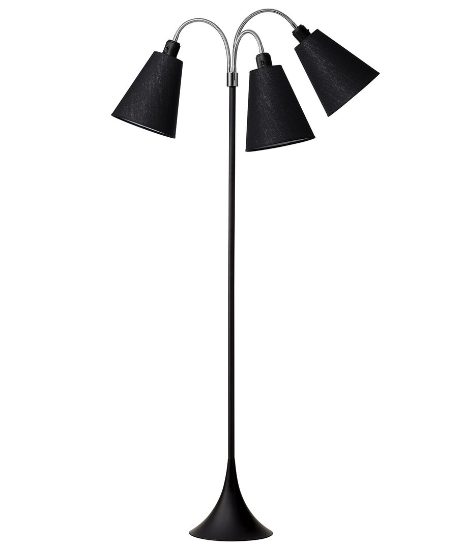 Een volledig zwarte vloerlamp met een vorm die zowel functioneel in gebruik als elegant om te zien is.