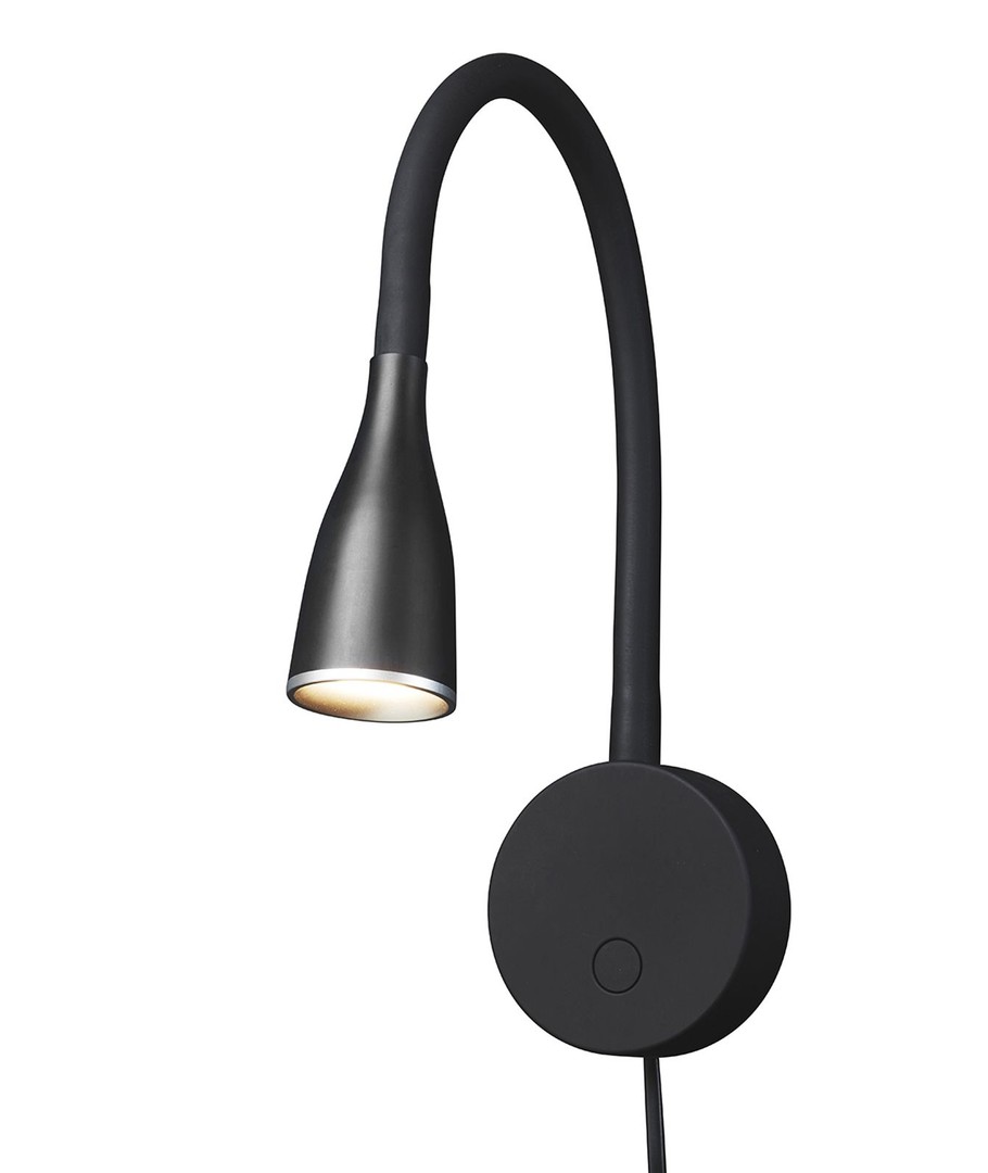 Eenvoudige Zwarte LED wandlamp genaamd EYE van Nielsen Light - De lamp wordt geleverd met een flexibele hals voor eenvoudige gerichte verlichting. De lamp geeft een mooi helder warm wit licht - perfect voor lezen thuis of in uw bedrijf. De LED lamp wordt gebruiksklaar geleverd met 1,5 meter snoer en stekker.
