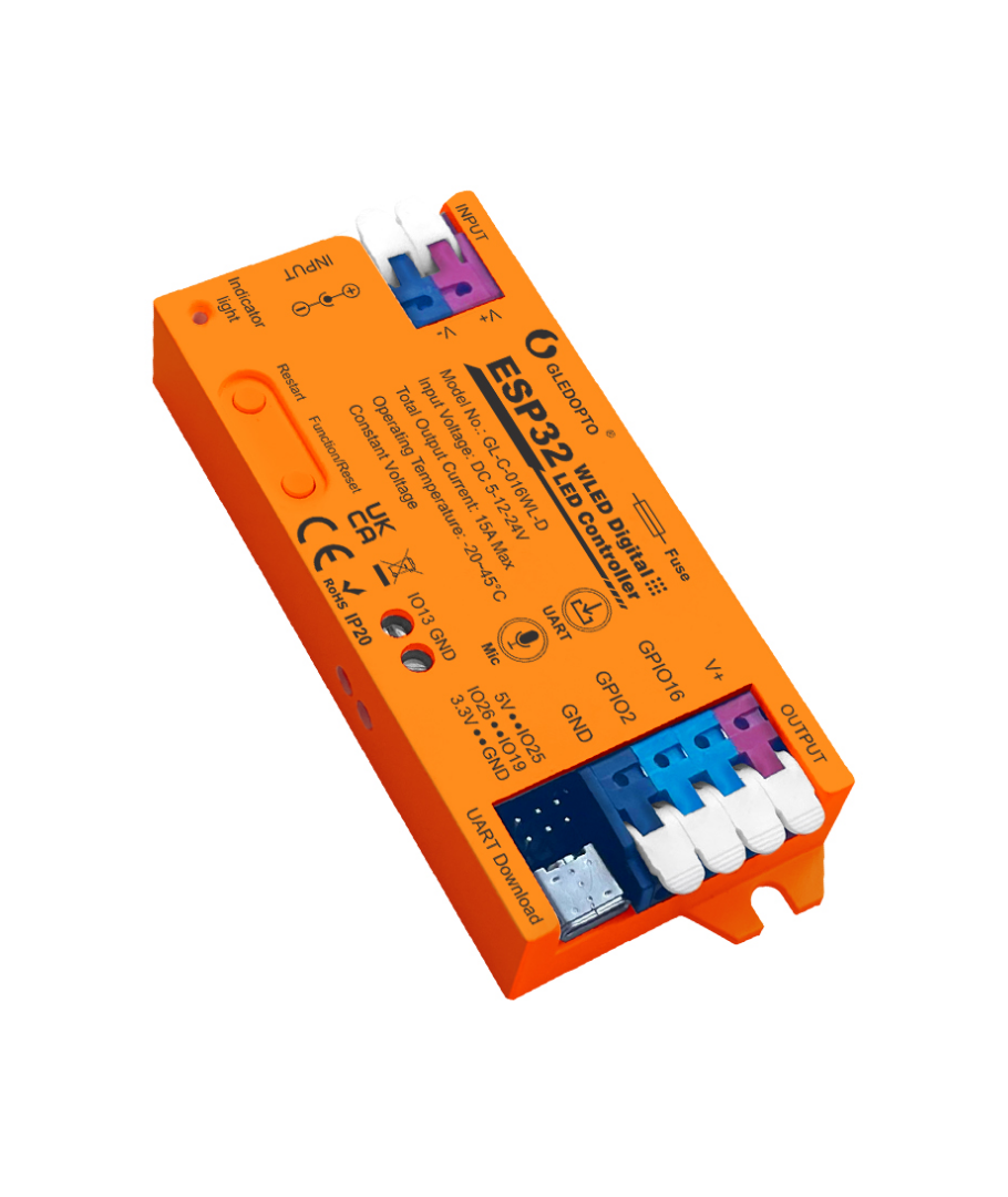 Gledopto ESP32 WLED IC-controller met klikterminals.