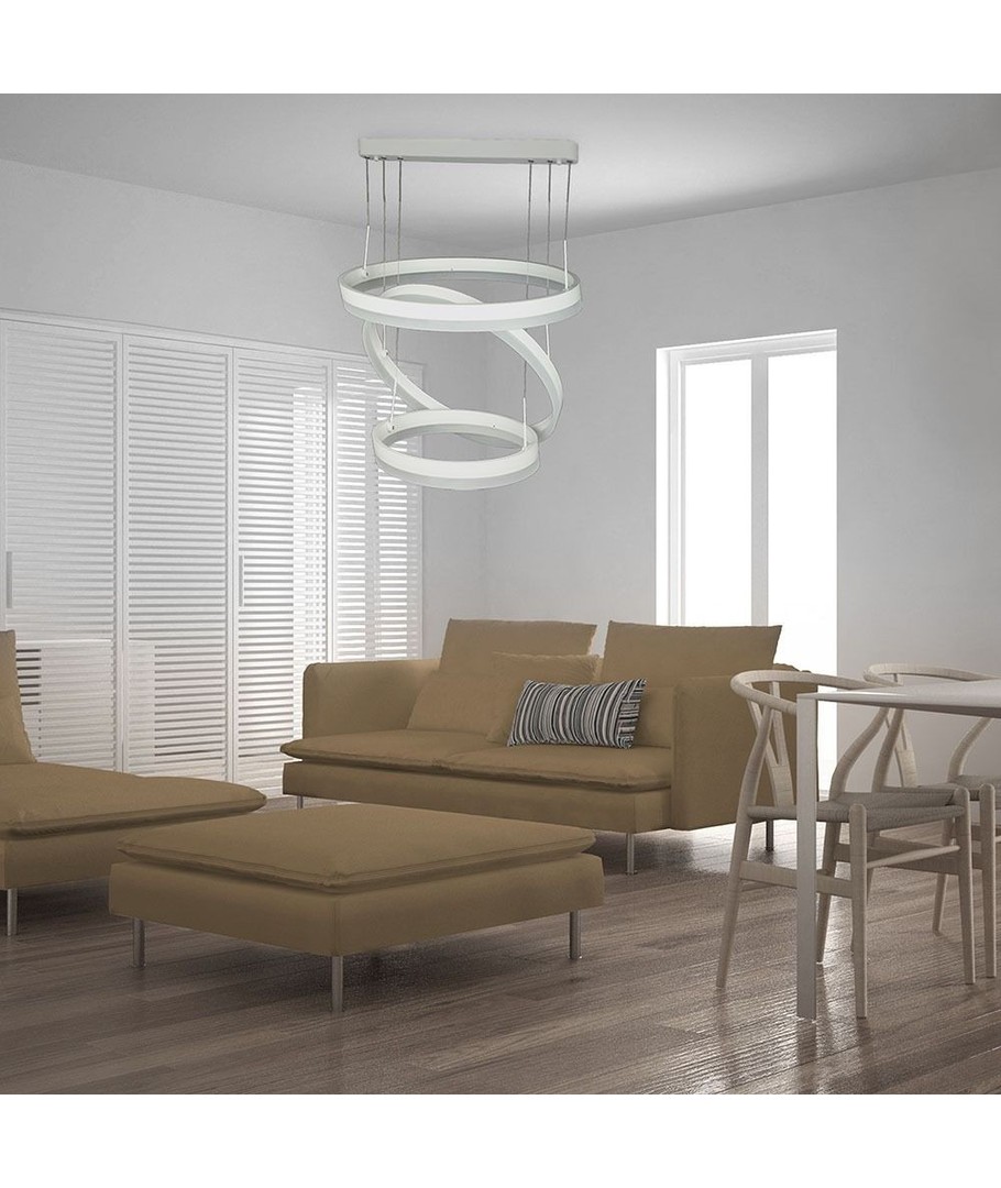 Skap en behagelig og avslappende atmosfære i hjemmet ditt med denne stilige lysekronen. Med sine tre dekorative ringer og varm hvit lysfarge på 3000K, er den designet for å tilføre rommet ditt et koselig preg.