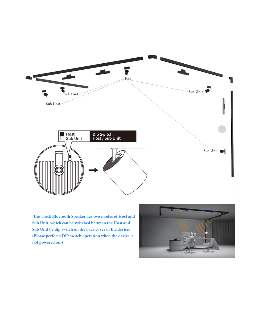 Den sorte Bluetooth høyttaleren til 3-faset skinner tilbyr en innovativ lydløsning som enkelt integreres i dine eksisterende skinnesystemer.