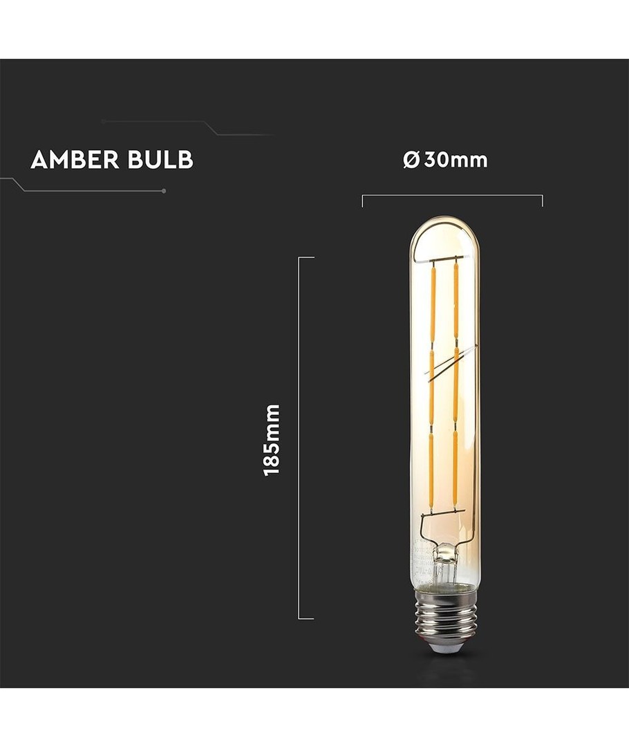 Med sine kompakte dimensjoner på 30 x 185 mm, passer denne pæren perfekt inn i små som store lamper, og dens elegante utforming med eksponerte karbonfilamenter gir et sofistikert og moderne preg til belysningsløsningen din.