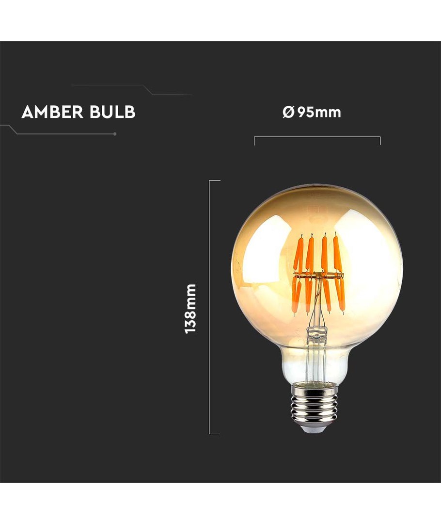 V-Tac G95 8W LED globepære er det perfekte valget for dem som ønsker en stilfull og effektiv belysningsløsning med en varm og innbydende glød.