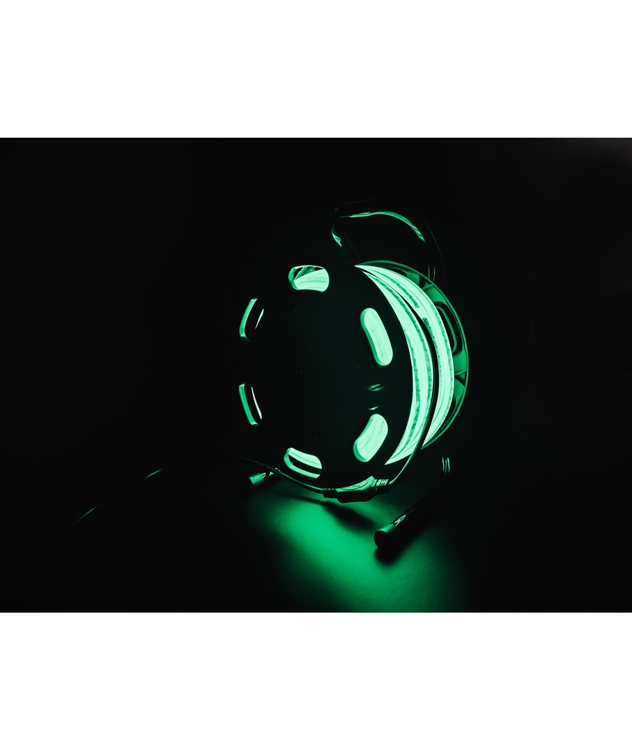 Få både kraftig arbeidslys og nødlys i ett produkt! Denne 25 meter lange LED strip med trommel leverer et sterkt lys når den er på, og lyser selvlysende grønt når den er av – perfekt for byggeplasser, garasjer og utendørsområder.
