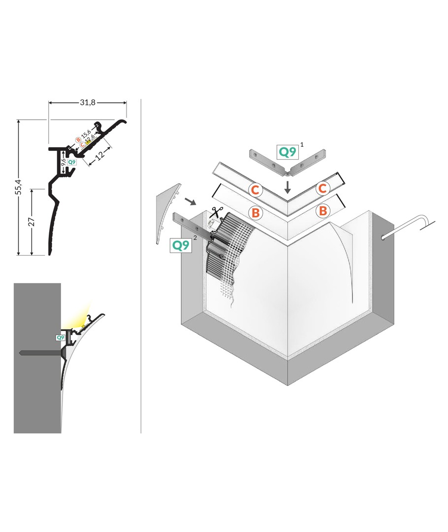 2m aluprofil SMOOTH12 BC/Q9 - Ubehandlet aluminium, innsparkling, LED-skinne Utvid