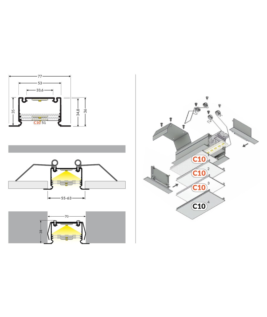 Ubehandlet aluminium, innebygd, LED-skinne