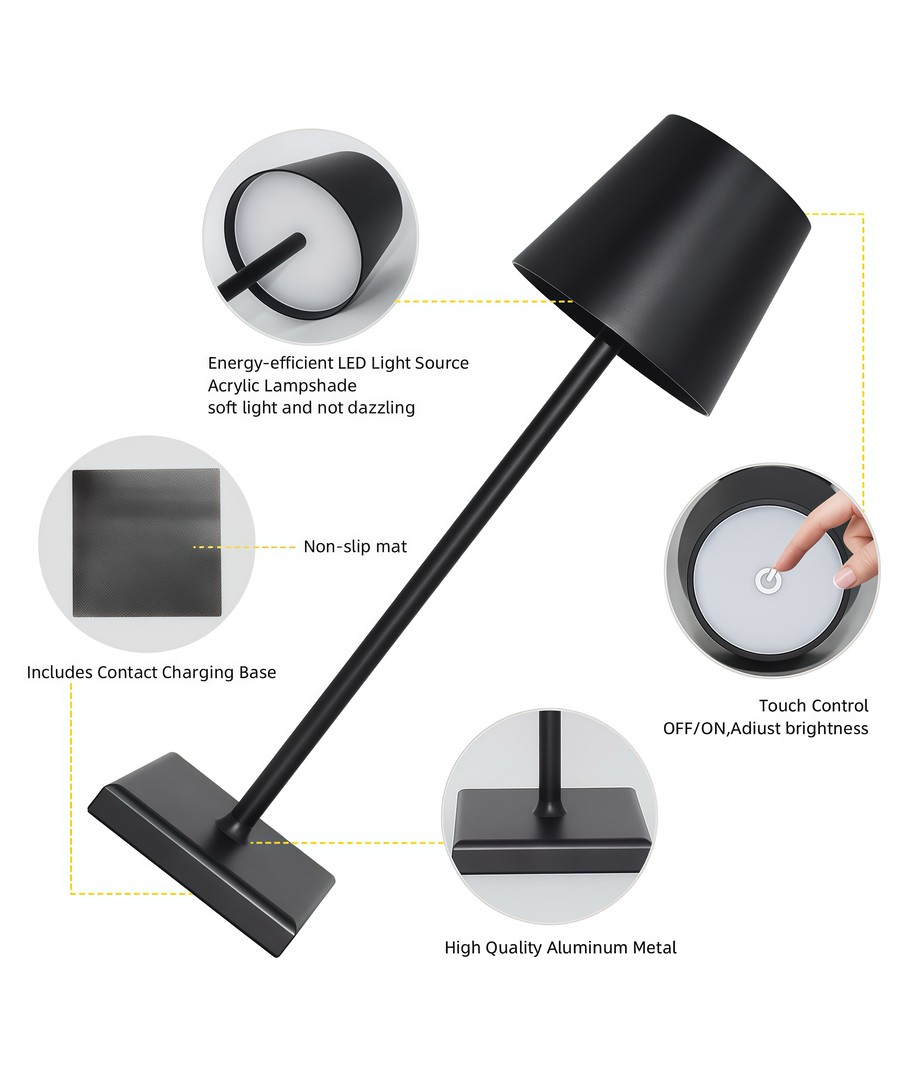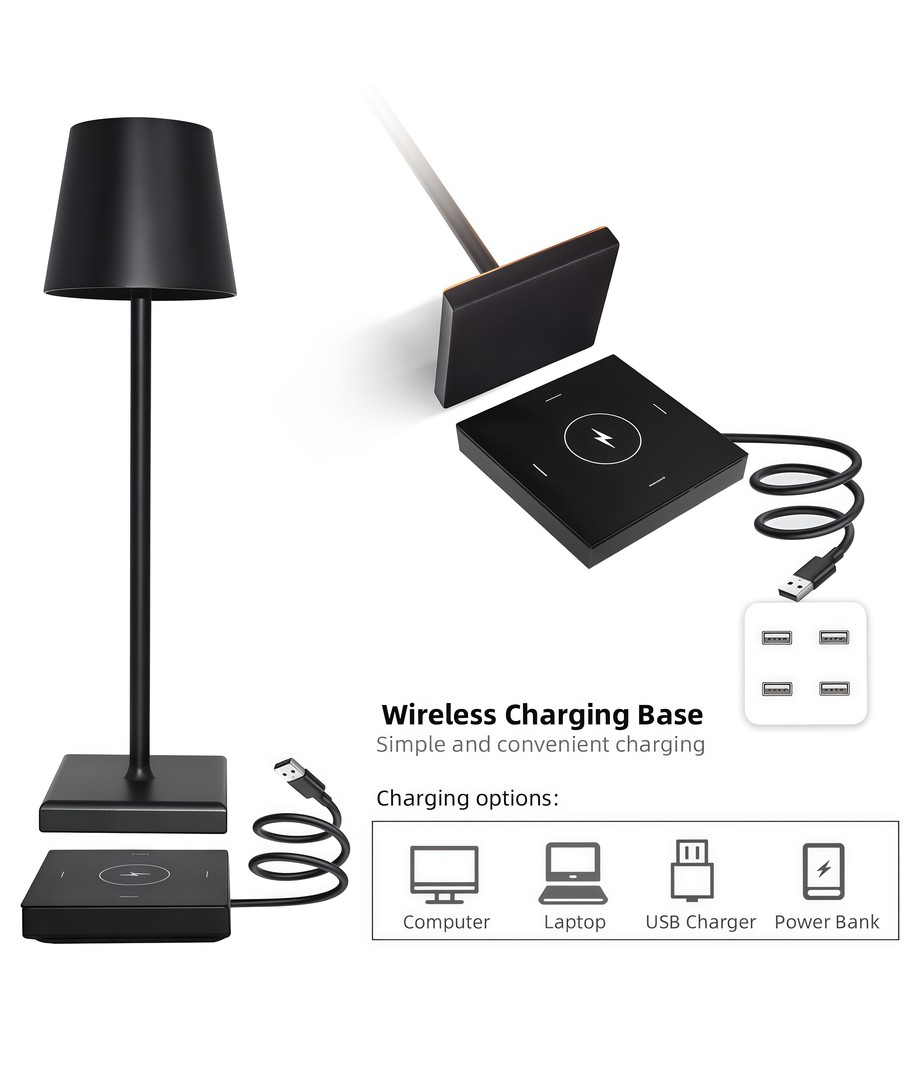 Opplev den ultimate kombinasjonen av belysning og teknologi med vår stilige LED-bordlampe med trådløs lading – perfekt for både innendørs og utendørs bruk.