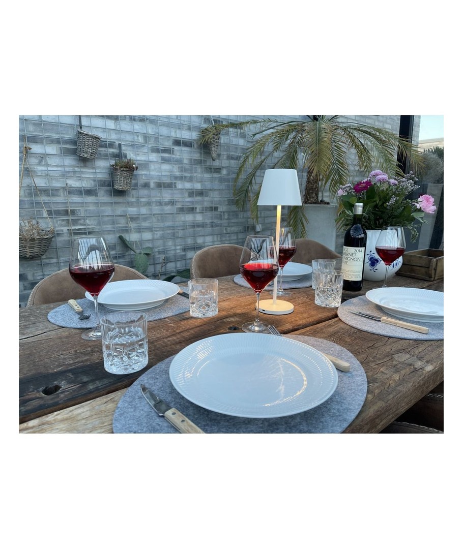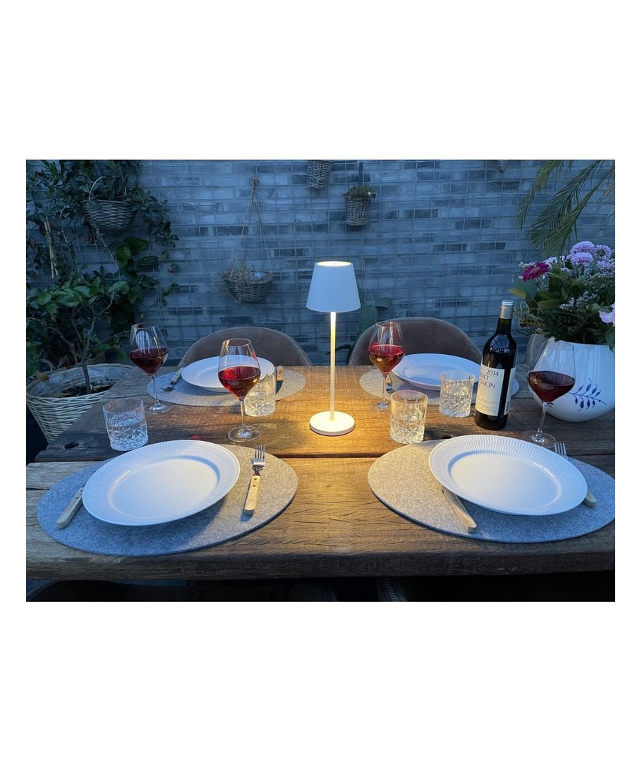 Calida-lampen er trådløs og oppladbar og kan derfor tas med dit du vil ha lyset. Lampen har en batterilevetid på 15 timer ved full lysstyrke – er vanntett, noe som gjør at lampen også er perfekt for terrassen hvor som helst ellers ute.