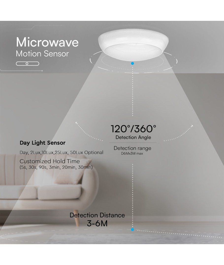 | Yderligere bemærkninger | Light-on duration: 5s, 30s, 90s, 3min, 20min, 30min. Sensor type: Microwave Sensor. Sensor angle: 360°Ceiling/120°Wall Mounted. Sensor distance: 3-6M. Ambient light level: Day,2lux,10lux,25lux,50lux optional. |