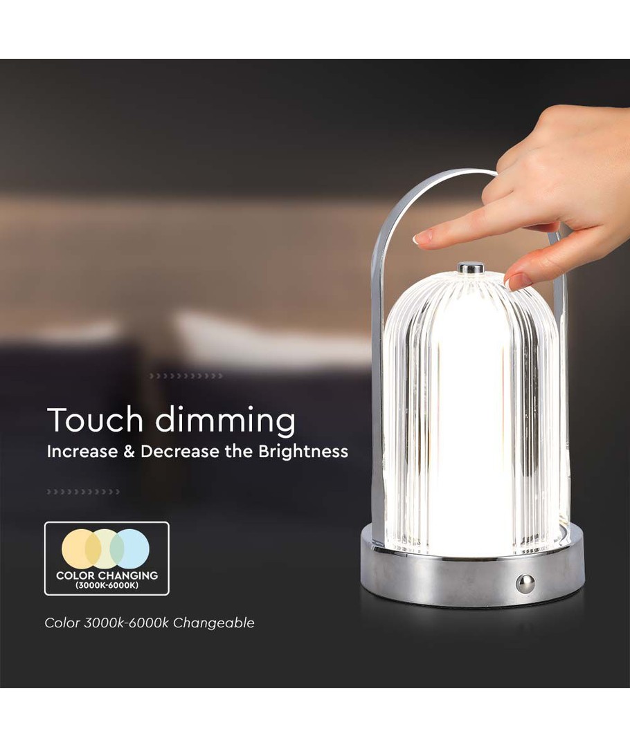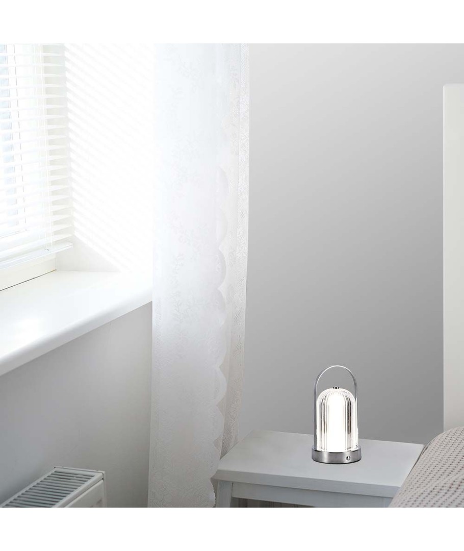Utstyrt med et høykapasitets 1800mAh batteri, gir denne lampen langvarig lys uten behov for konstant lading. Den innebygde lyskilden betyr at du aldri behøver å tenke på bytte av lyspærer, mens det stilrene kromhuset sikrer at lampen ser flott ut i ethvert interiør.