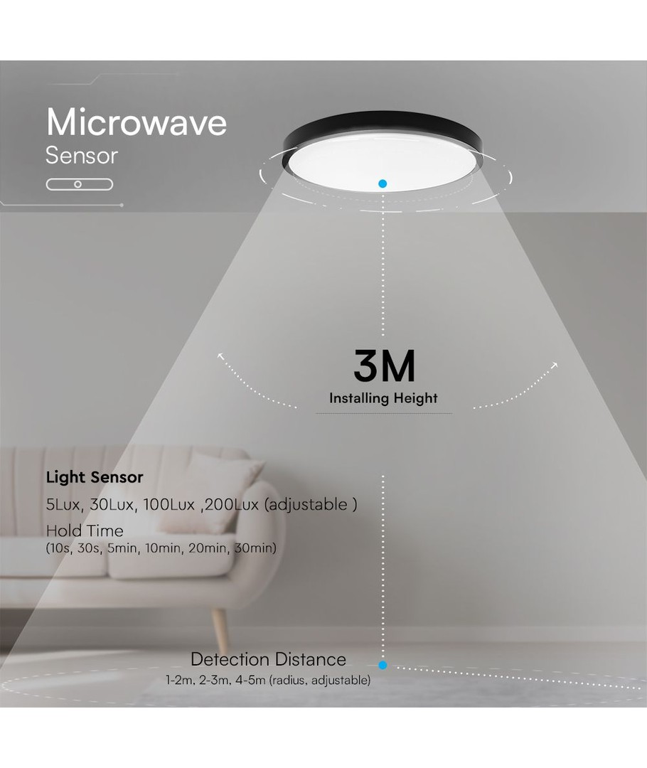 Anvend vennligst en 230V forsyning for å koble til lampen. Den integrerte sensoren sørger for automatisk aktivering når det er bevegelse i nærheten, mens medfølgende fjernkontroll gjør det enkelt å justere lampens innstillinger etter dine behov.