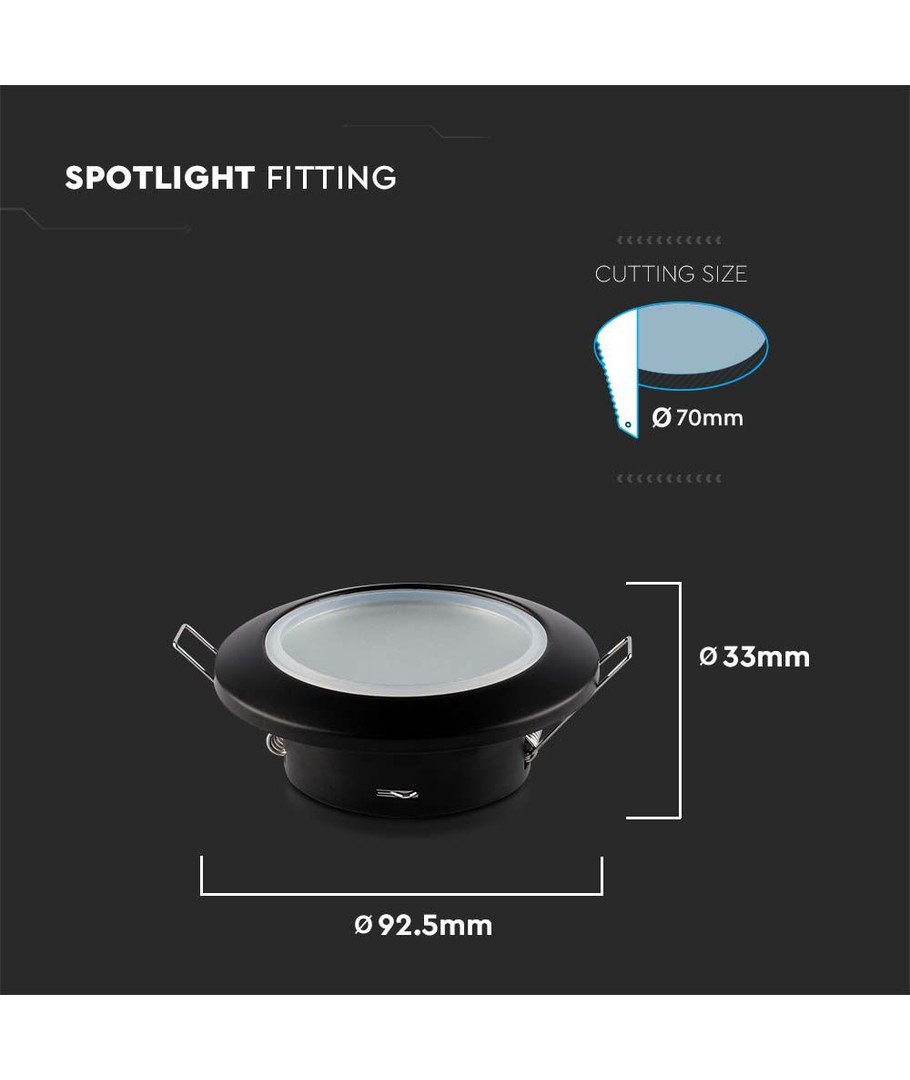 Designet for å være kompakt, har lampen dimensjoner på 92.5 x 33 mm og krever en hulstørrelse på 70 mm for installasjon, noe som gjør den perfekt for plassbesparende montering i tak eller vegg.