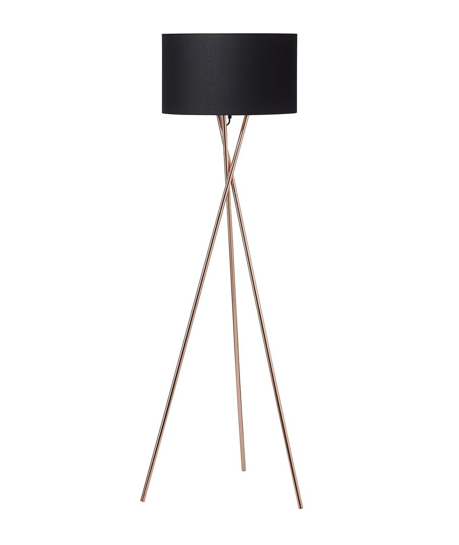 Uptown Gulvlampe fra Nielsen Light, med metall tripod-stativ og stoffskjerm. De 3 bena er utført i glatt metall, hvor ledningen er skjult i det ene benet. Det gir lampen et flott stilrent utseende, og den store stoffskjermen er prikken over i-en. Det er E27 fatning til max 60 watt halogenpære eller max 10 watt LED. Det er montert gulvbryter på ledningen.