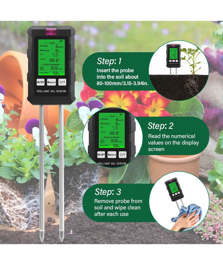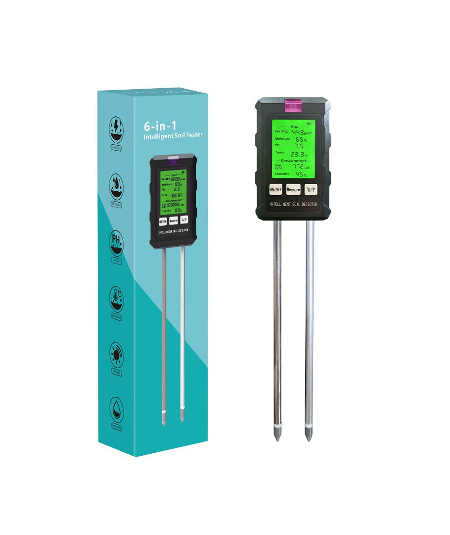 Opplev presisjon og allsidighet med vår 6 i 1 måler, som forenkler pleien av plantene dine ved å måle pH, fuktighet, temperatur, lysintensitet, næringsinnholdet i jorden samt luftfuktighet i én kompakt enhet.