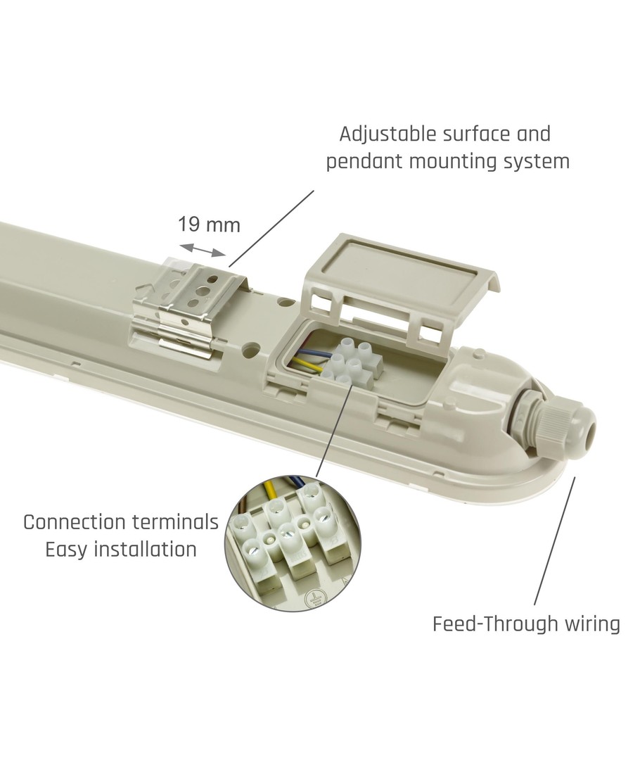 Armaturen har dimensjoner på 1250 x 72 x 70 mm og kommer med en integrert lyskilde for en lettvint monteringsprosess.