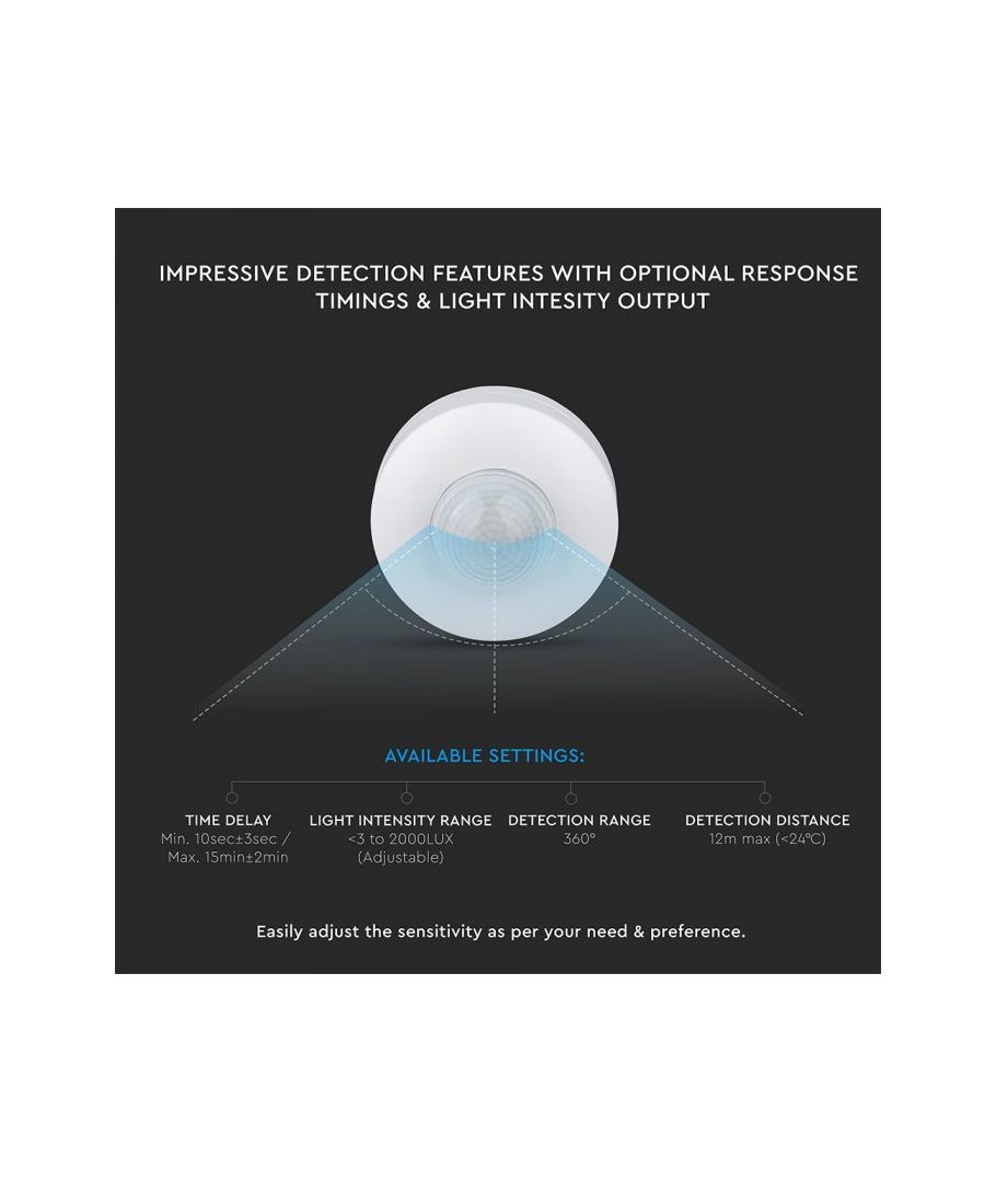 Sensor avstand opp til 12 meter (Under 24 grader celsius og ved monteringshøyde mellom 1,8m og 2,5m).