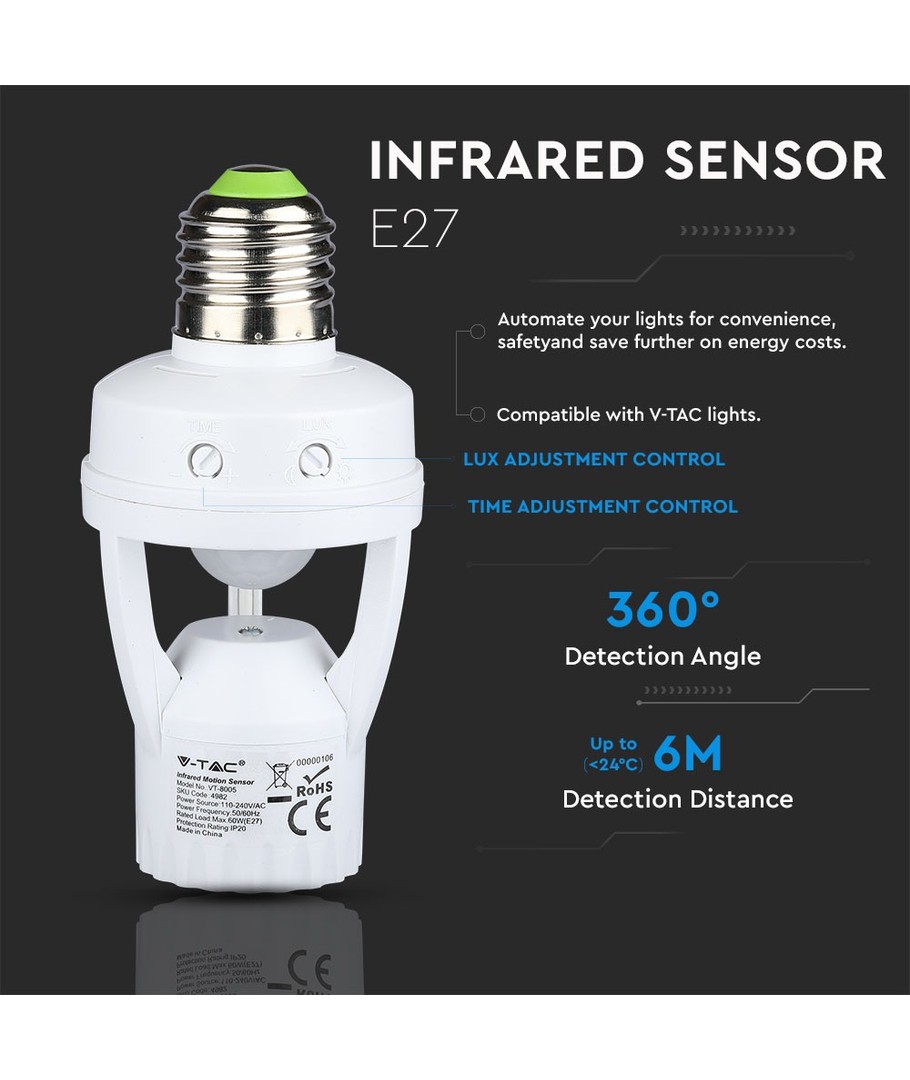 120°/360°, hvit, rekkevidde opptil 6m, justerbar tid og lux