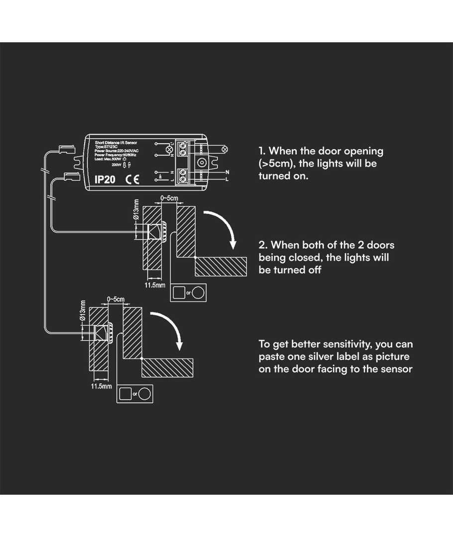 - Energibesparende: Lyset tennes automatisk når døren åpnes (over 5-6 cm), og slukkes når døren er nær sensoren.