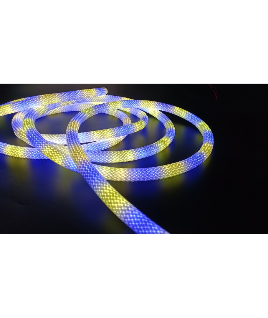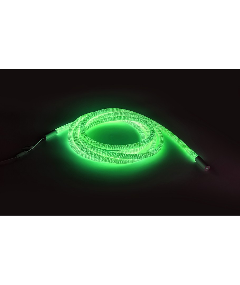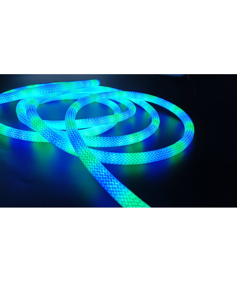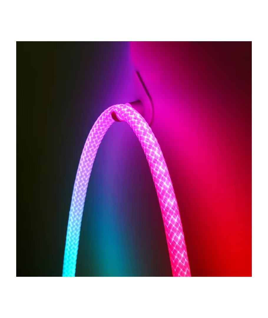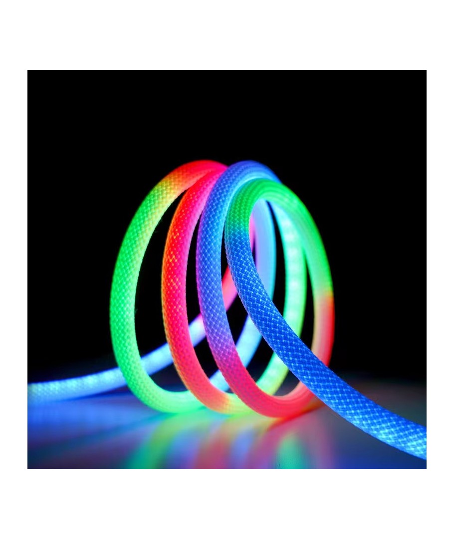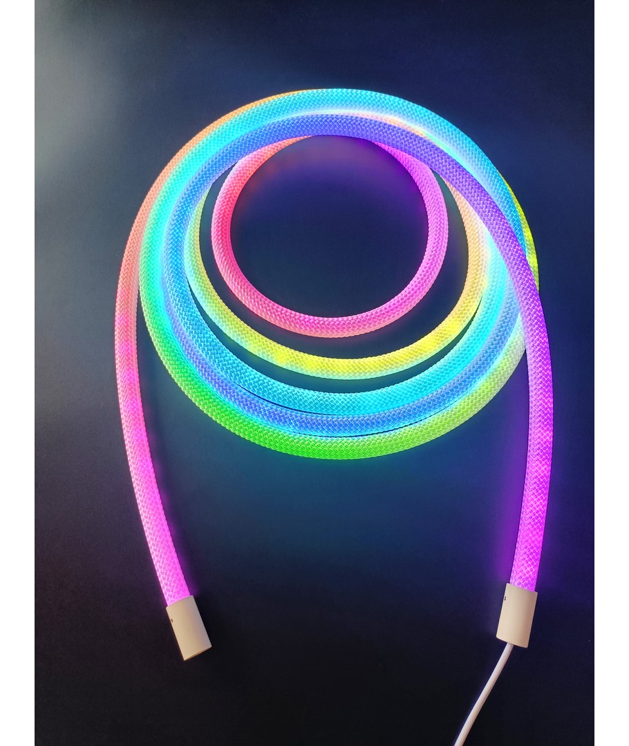 Opplev en verden av farger med vår 3W/m RGBIC Neon Flex strip med vevd tau - en 3 meter RGBIC neon flex, som bringer lys og liv til ethvert rom med sitt dynamiske fargespill og fleksible design.