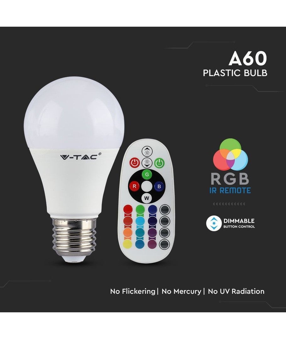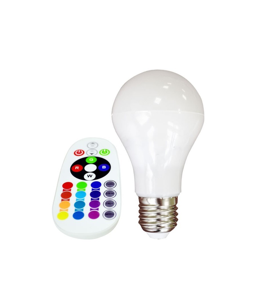 5 stk. RGBW E27 pære med fjernkontroll, hvor man kan bytte farge.