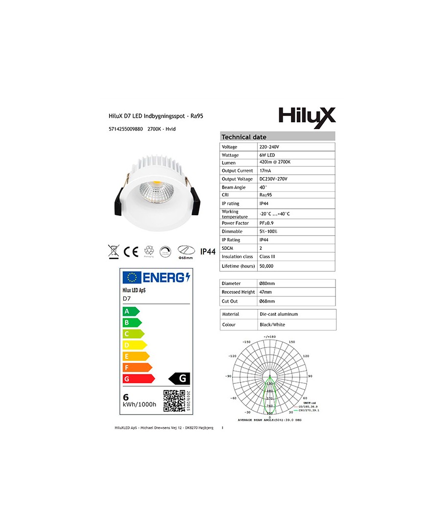 HiluX D7 Gen2 har en kompakt, hvit utforming med dimensjoner på 49 x Ø80 mm og krever en hul størrelse på 68 mm for montering. Den integrerte lyskilden gjør at du slipper tenke på separat pæreinnkjøp, slik at installasjonen blir mindre tidkrevende og mer kostnadseffektiv.