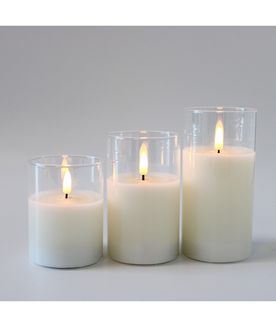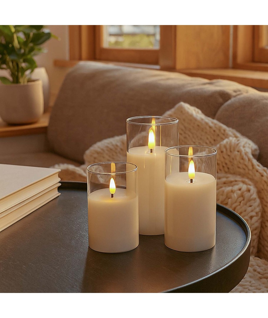 Opplev den varme og koselige atmosfæren som LED Blokklys sett i glass bringer til ditt hjem. Dette settet med tre blokklys gir deg muligheten til å nyte den vakre flammeeffekten uten bryet med røyk eller brannfare.
