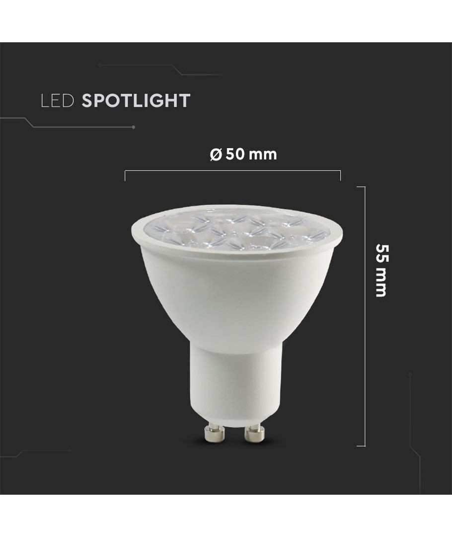 Det er utstyrt med en Samsung LED chip og en GU10 fatning som erstatter tradisjonelle 50W spot.