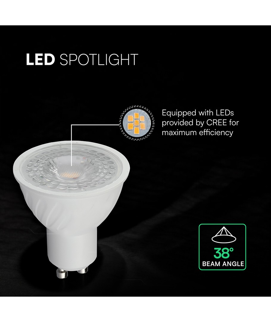 Opplev en fantastisk belysningsopplevelse med vår VT-227 spotlight, som tilbyr pålitelig og energieffektiv belysning med en 6W GU10 fatning. Denne lyskilden er utstyrt med en Cree-chip som sikrer høy kvalitet og lang levetid, og leverer en lysstyrke på 445 lumen.