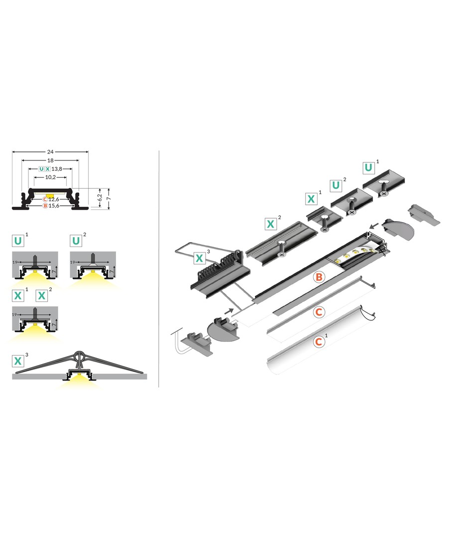 Svart anodisert, innebygd, LED skinne