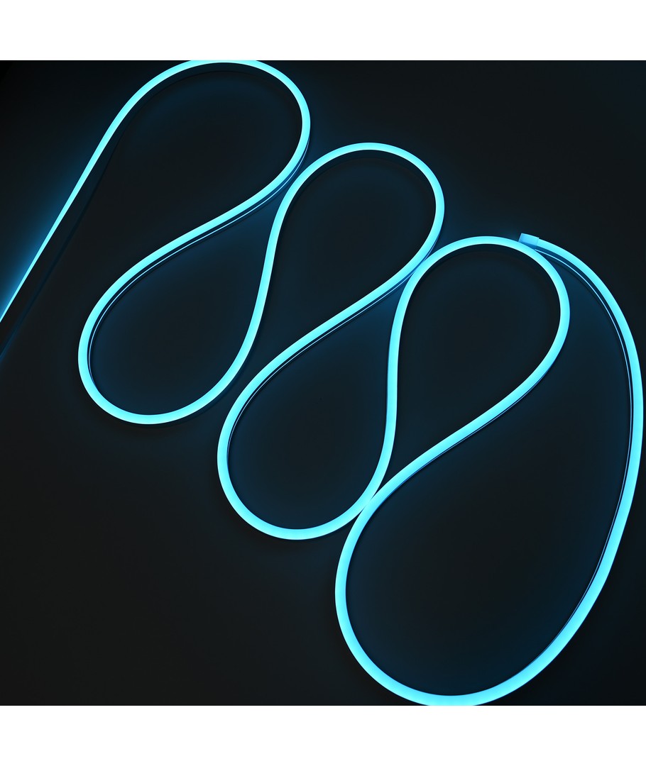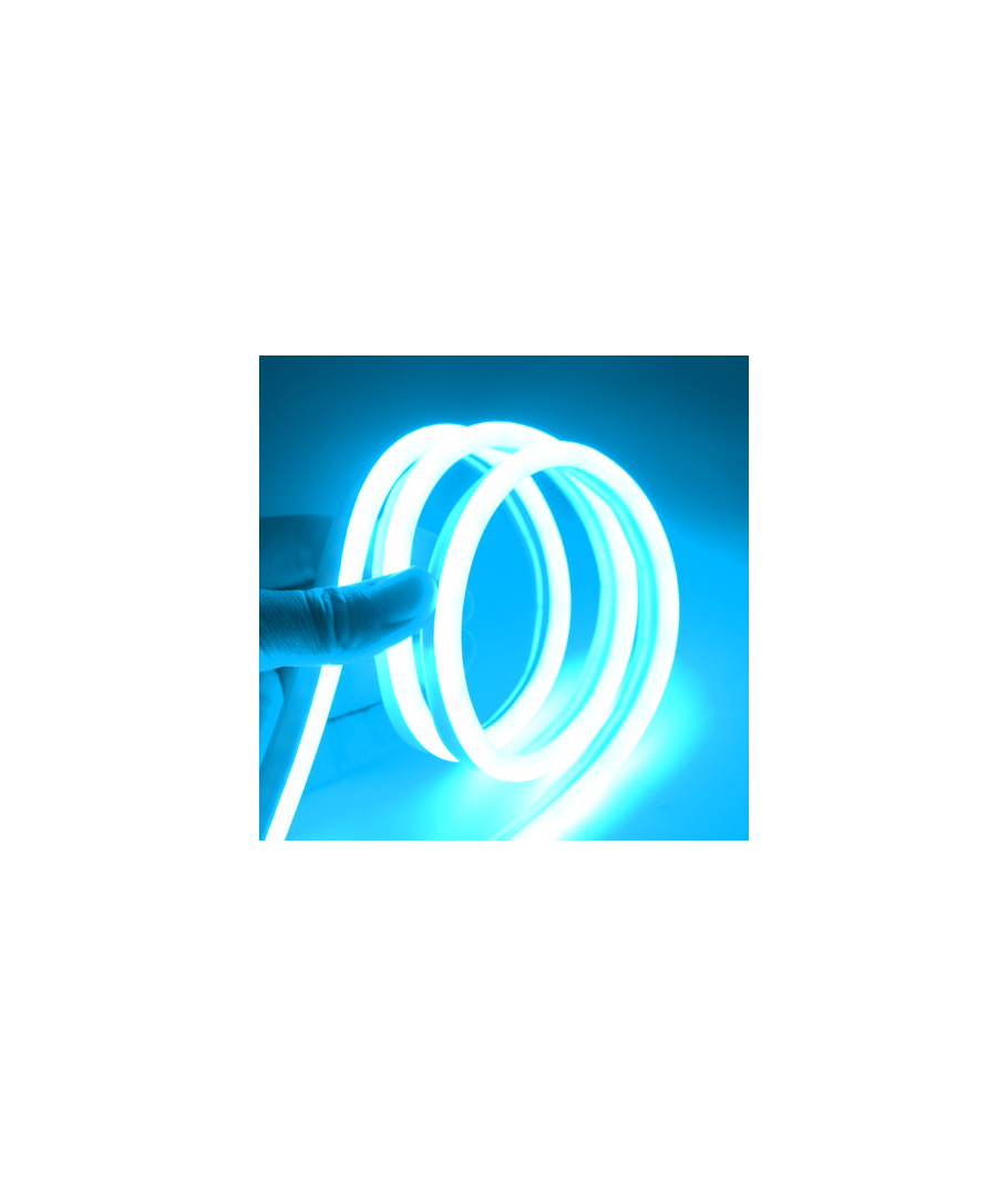 Vår lyseblå 5m 8W/m Neon Flex LED stripe lyser opp ethvert rom med en farge som er både beroligende og stilig. Med en imponerende lysstyrke på 355 lumen/meter og en spredning på 100 grader, fordeles lyset jevnt for å skape en innbydende atmosfære.
