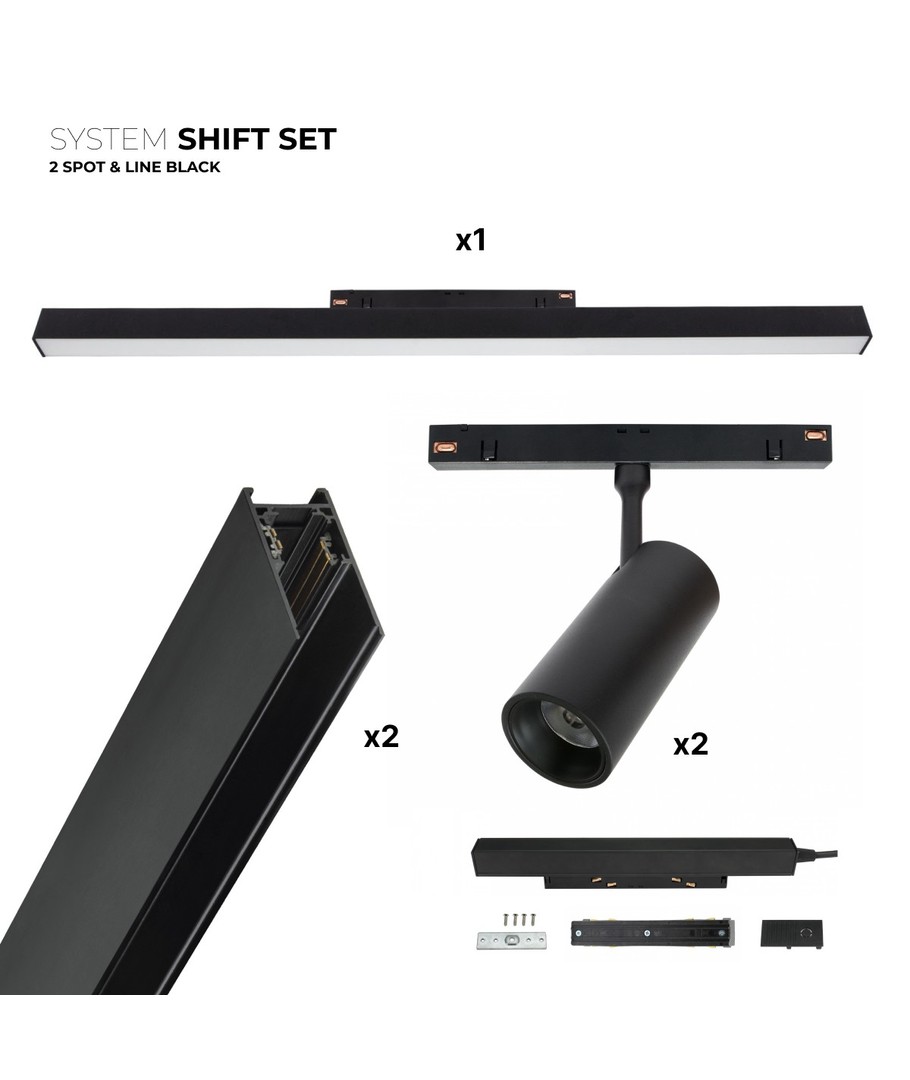 I dette SHIFT-settet får du 2x 1 meter skinner, 2 LED-spotter og en lysskinne, samt alt du trenger for å installere settet.