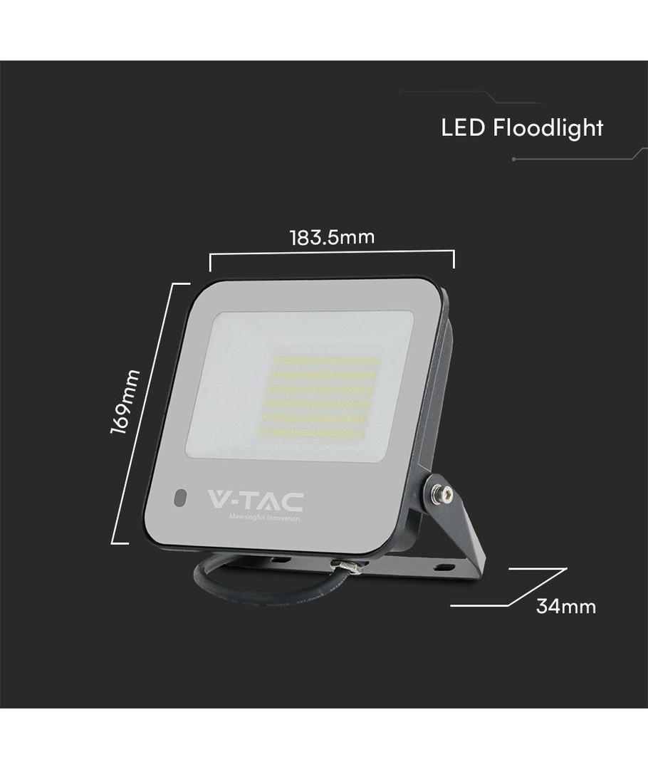 V-Tac LED lyskasteren er designet for å tåle ekstreme værforhold med sin IP65-klassifisering, noe som gjør den motstandsdyktig mot vannsprut og regn. Dens slanke design med dimensjoner på 169 x 183,5 x 34 mm gjør den enkel å montere nesten hvor som helst.