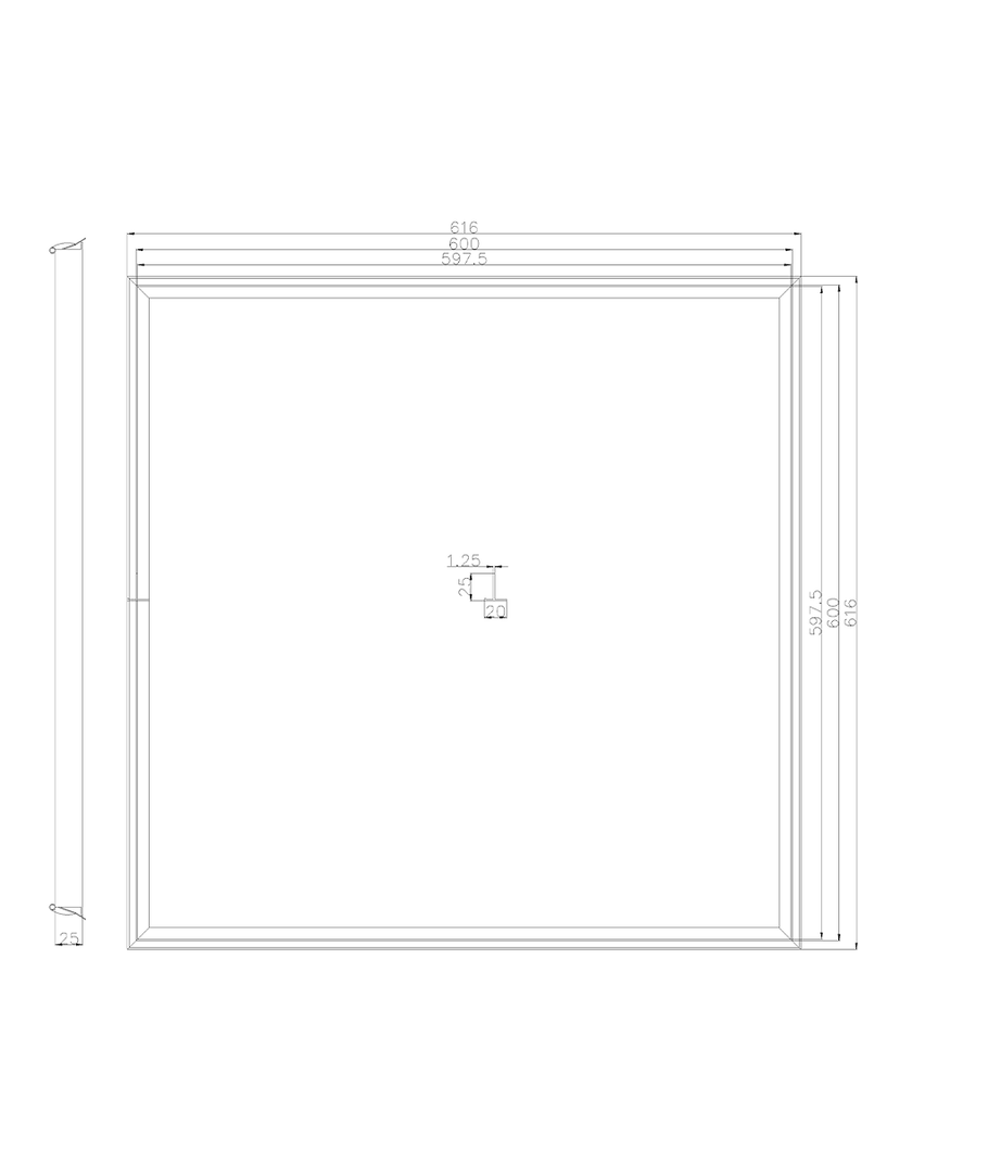 Dimensjoner: 600 x 25 x 600 mm.