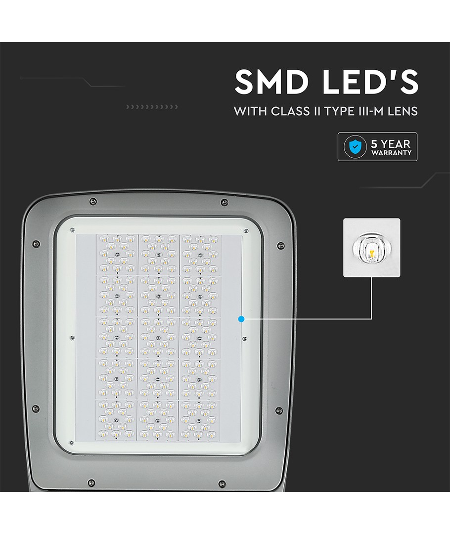 Denne 160W LED gatebelysningen gir en utmerket lysstyrke på hele 20800 lumen. Med en høy lysspredning på 150/80 grader sikrer denne lampen jevn lysfordeling over større områder, noe som gjør den ideell for uteområder og gater.