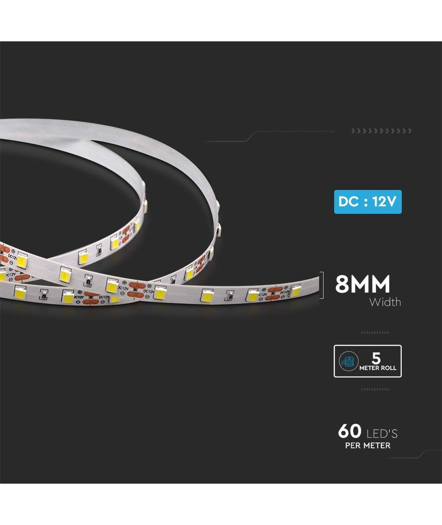 Stripen krever en 12V DC strømkilde og er designet med 8W/meter effektivitet. Med en RA-verdi på80-85, gir denne LED-stripen et naturlig lys som er perfekt for de fleste belysningsbehov. En av de fremragende funksjonene er at den kan dimmes for optimal lysstyring.