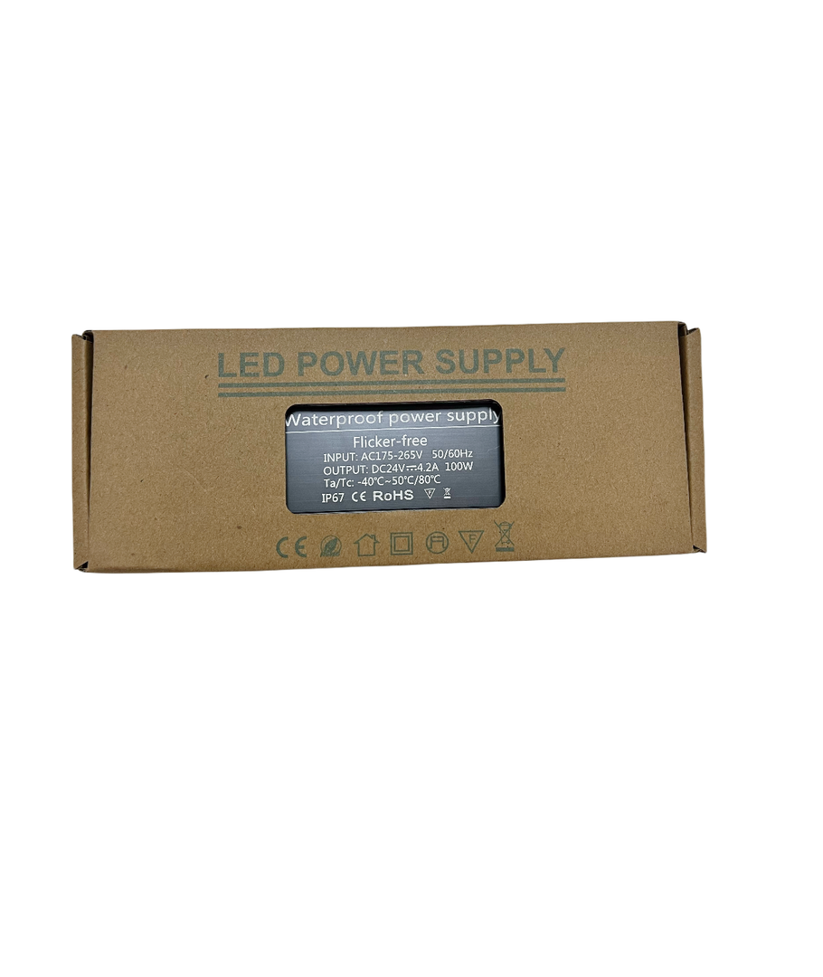 Den nye 100W strømforsyningen 24V DC - 4.1A leverer pålitelig strøm uten flimring og er perfekt for både innendørs og utendørs bruk takket være IP67-sertifiseringen.