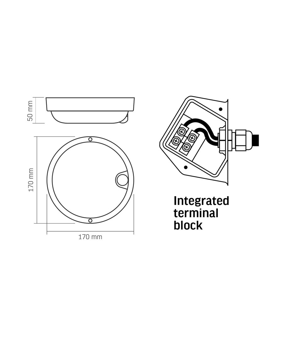 Med en kompakt størrelse på 170 x 170 x 50 mm passer den perfekt inn i forskjellige omgivelser. Takket være IP54-klassifiseringen tåler lampen både fuktig luft og vannsprut, noe som gjør den egnet for utendørsbruk.
