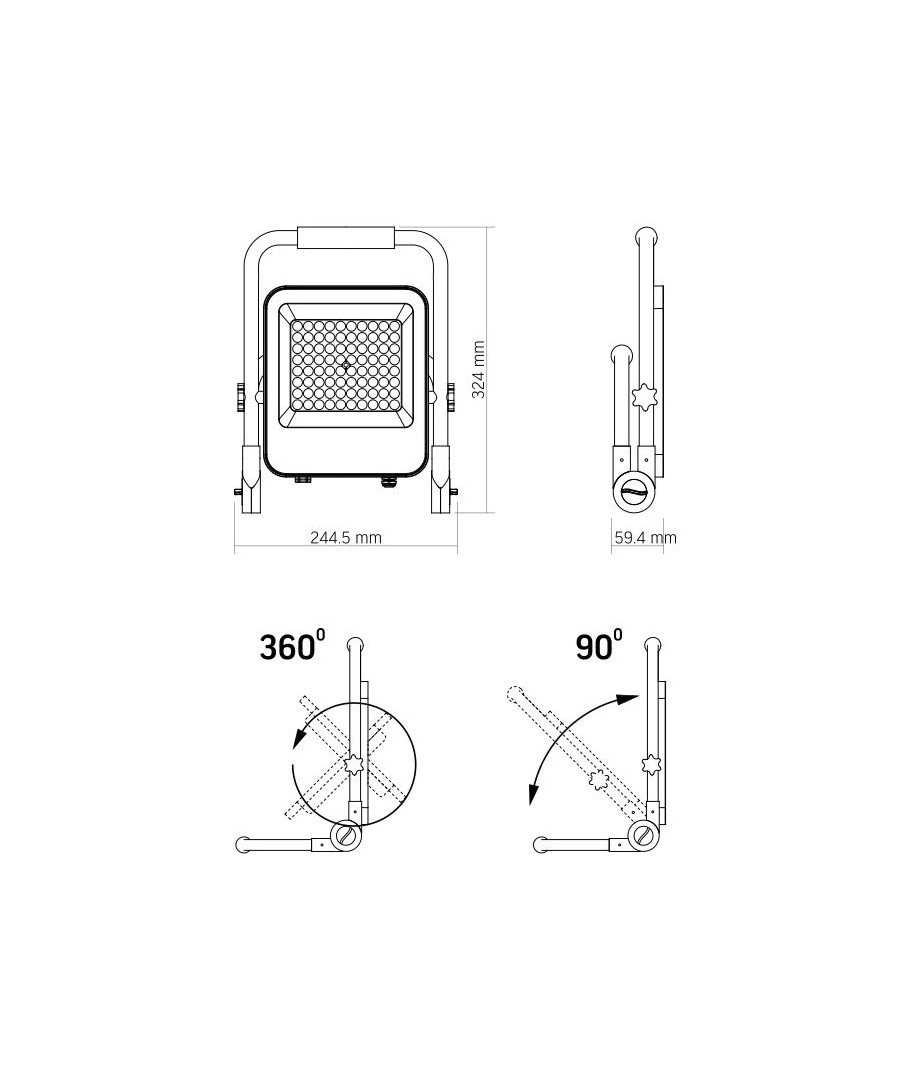 Med en robust konstruksjon og vanntett design, er lyskasteren klassifisert med IP65, noe som gjør den egnet for utendørs bruk, da den kan motstå både vannsprut og regn. Produktdimensjonene er 244.5 x 324 x 59.4 mm.