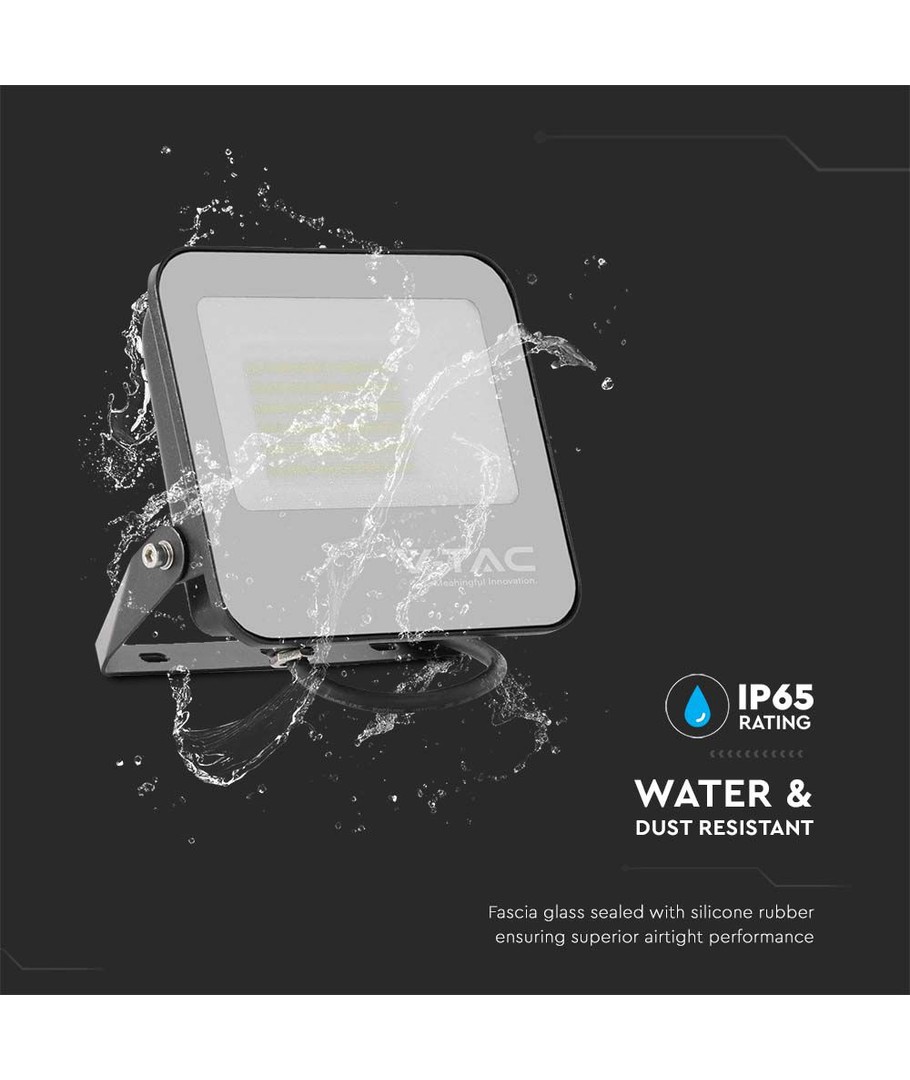 Med en IP65 klassificering kan projektøren bruges udendørs, da den tåler både vandsprøjt og regn. Dette gør den velegnet til belysning af haver, indkørsler og byggepladser.