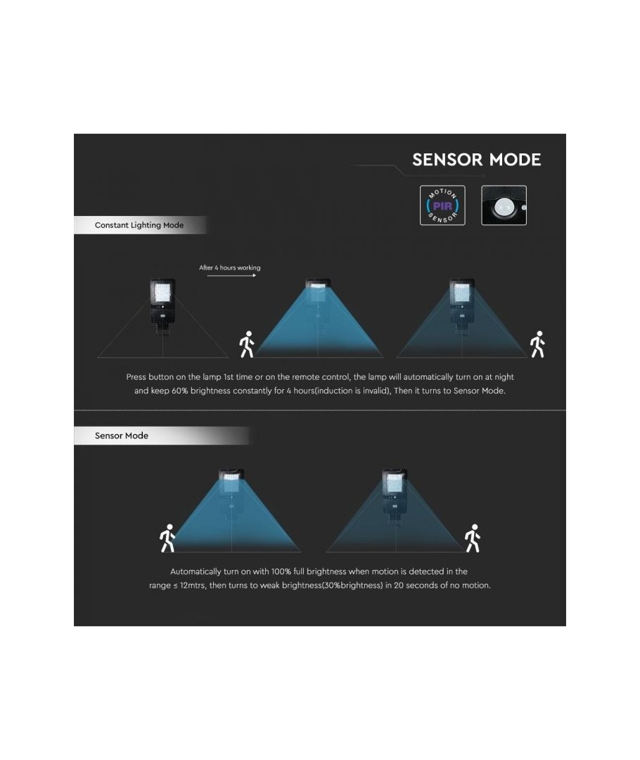 Denne lampe er designet til at give belysning uden behov for elektricitet og er perfekt til udendørsområder. Med dens IP65-klassificering er den vandtæt og holdbar i alle vejrforhold. Den har en sensor, der aktiveres i en rækkevide på 8-12 meter, hvilket gør den ideel til at opdage bevægelse og give lys, når det er nødvendigt. Lampen kan fungere i op til 36-120 timer på kun 8-10 timers opladningstid, hvilket sikrer langvarig og pålidelig belysning. Vælg denne gadelampe for en effektiv og miljøvenlig løsning til udendørsbelysning!