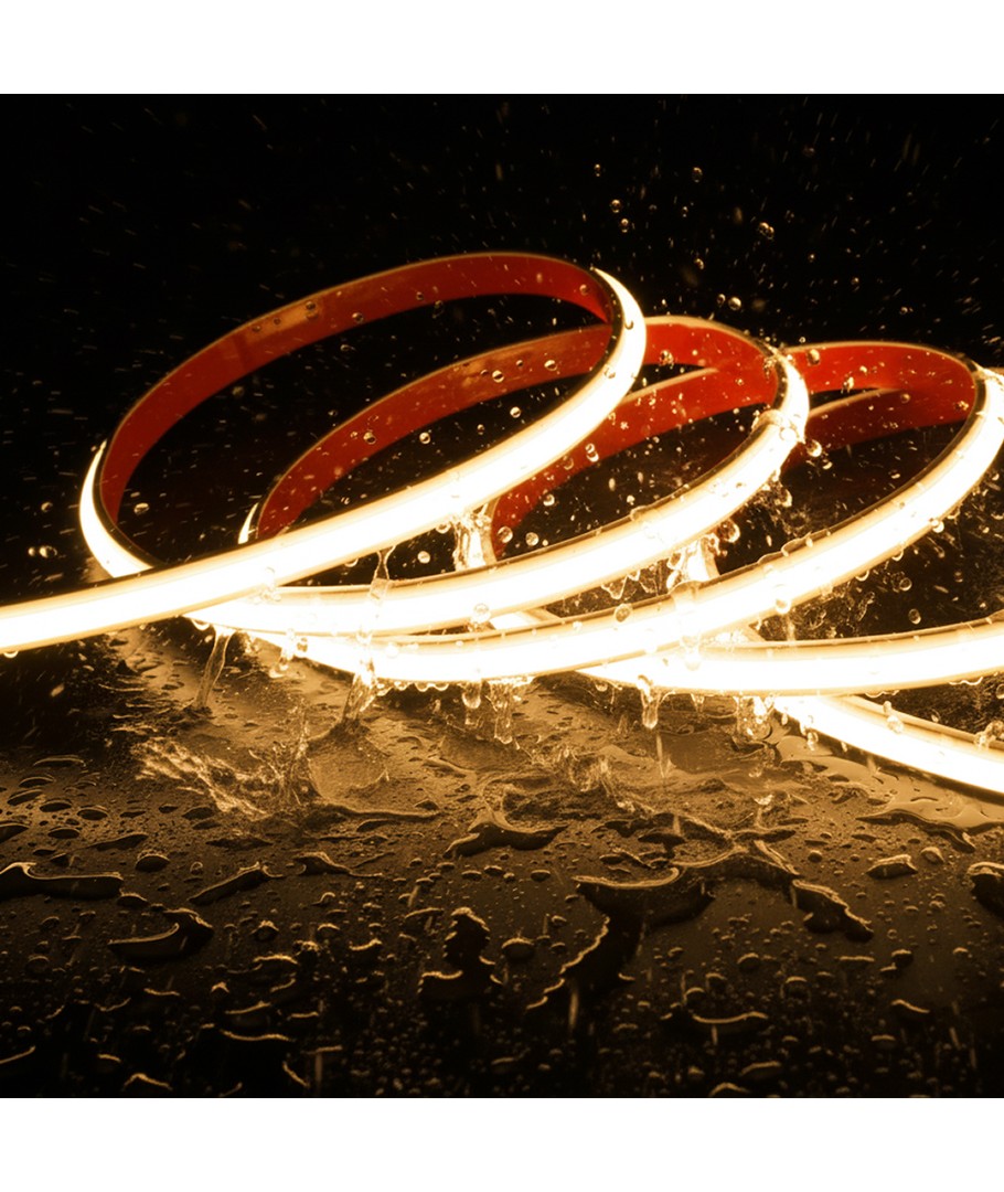 Denna vattentäta slim COB LED-strip på 230V levererar ett kraftigt, jämnt ljus helt utan synliga dioder. Det betyder att du får ett elegant ljusband utan hål i ljuset – och eftersom strippen körs direkt på 230V, finns det inget behov av transformator. Monteringen är enkel med den förmonterade tejpen på baksidan, och du kan beställa den i upp till 50 meter i ett sammanhängande stycke.