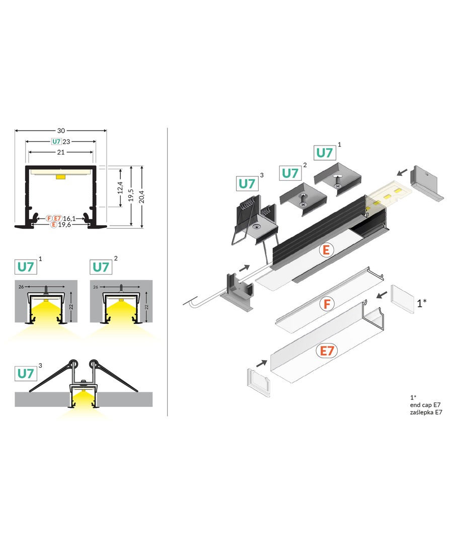 Anodiserad, infälld, LED-skena