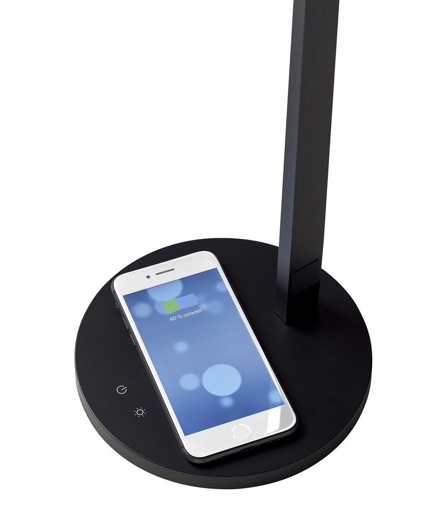 Enkel, stilren och smart LED bordslampa i svart med 3-stegs Touch dim på lampan från Nielsen Light. Levereras med inbyggd mobilladdare, så att du bara kan lägga mobilen på lampans fot för trådlös laddning.